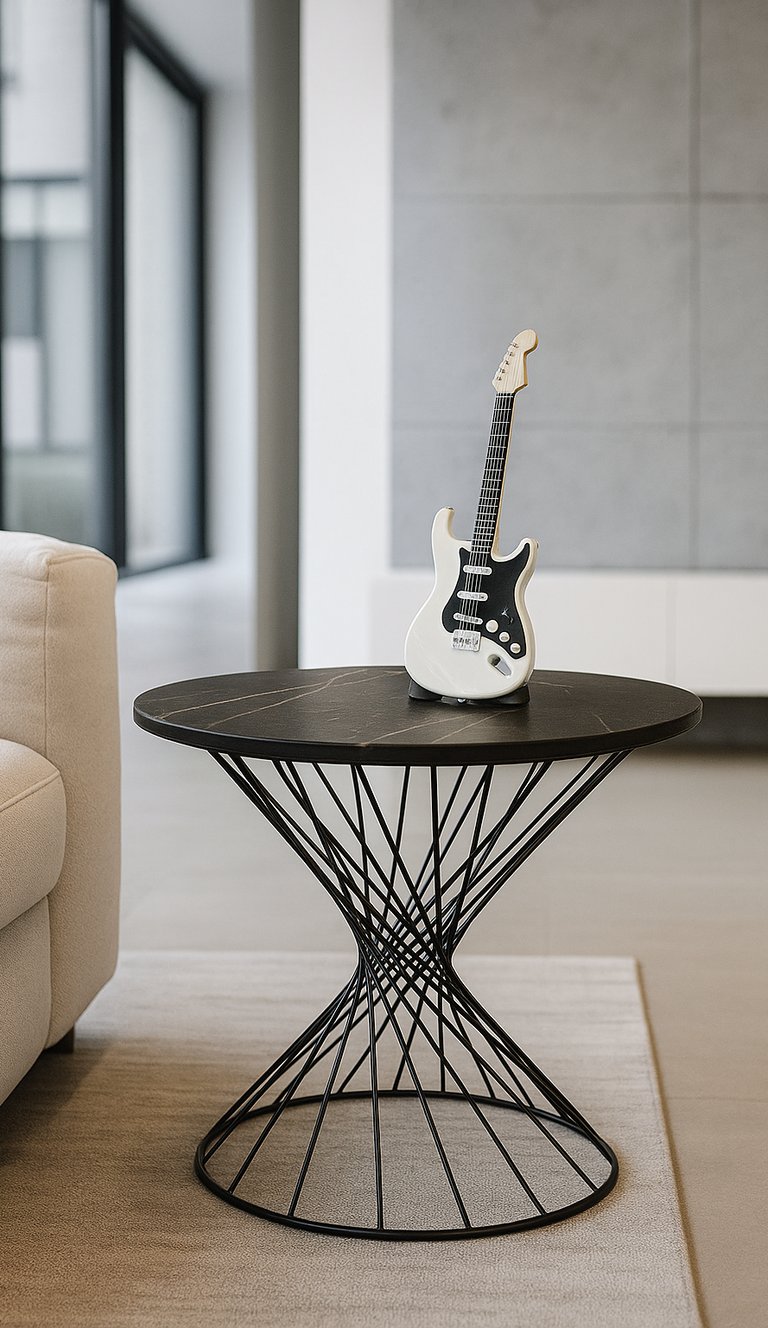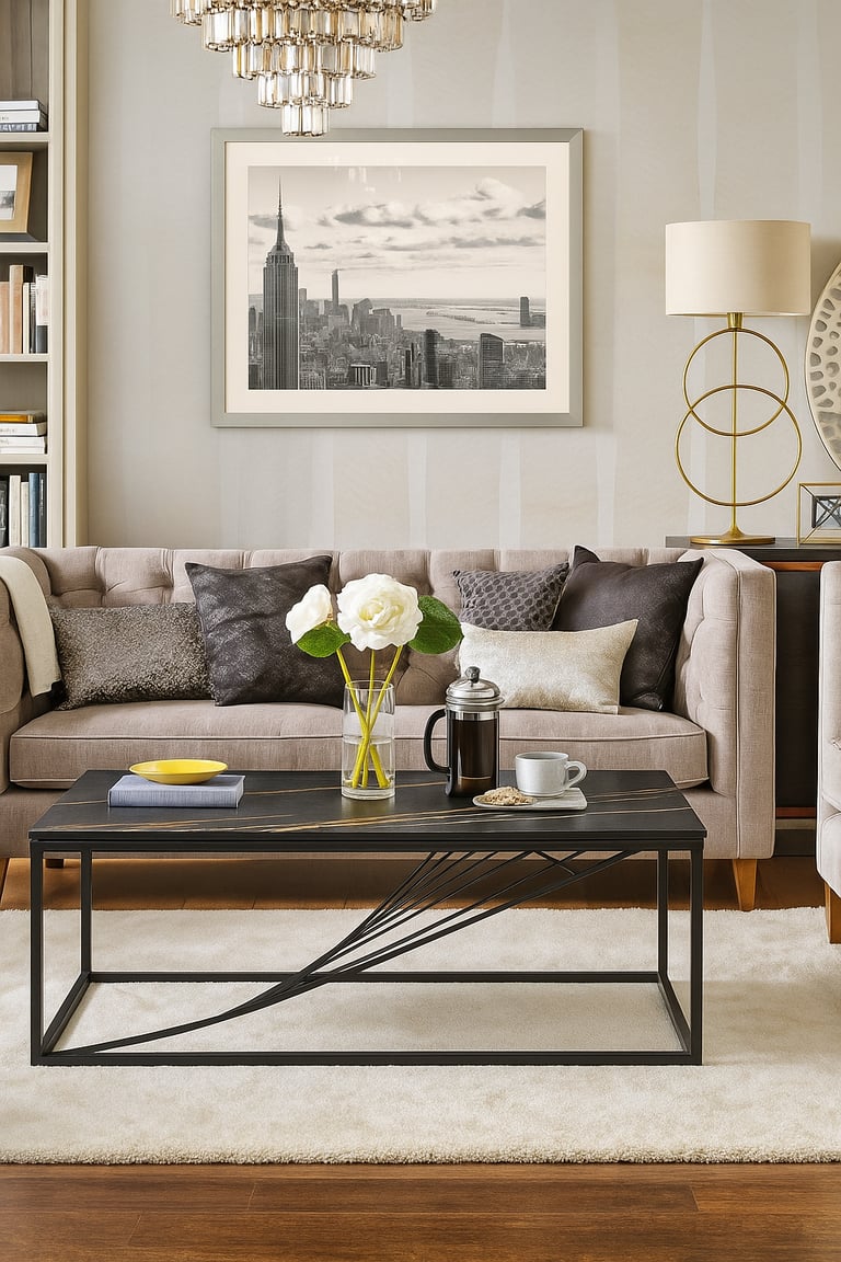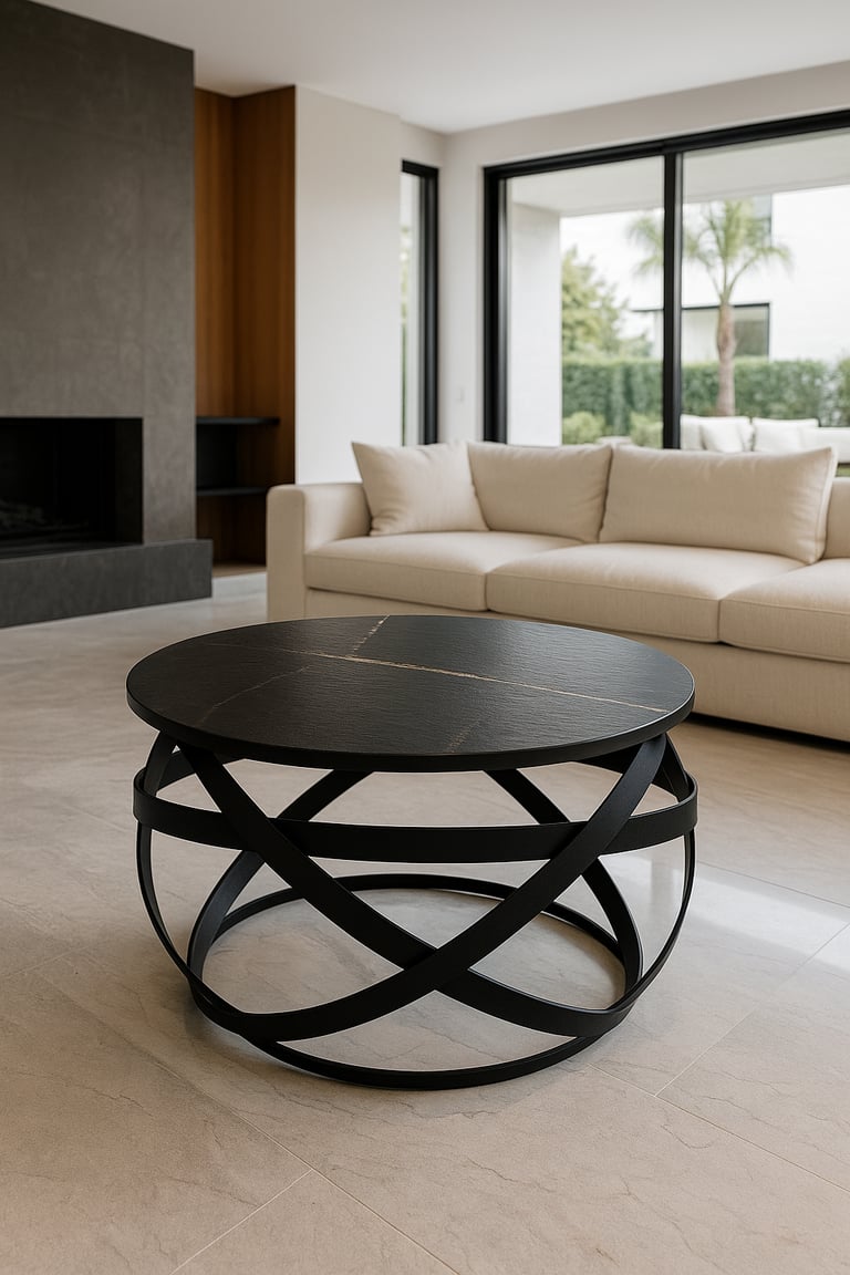 Muebles en piedra sinterizada con estructuras metálicas.